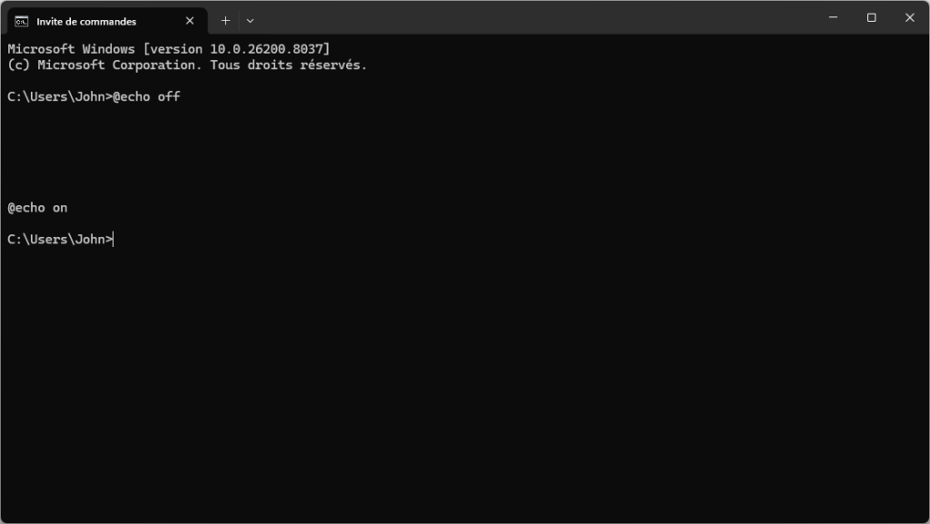 C’est uniquement en tapant la commande « @echo on » que l’affichage revient à son état standard.