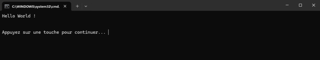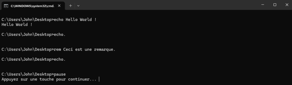 Donc après avoir appuyé sur un touche, le script reprend, ou s’arrête dans notre cas car la commande est à la fin du script (la fenêtre de l’invite de commandes disparait).